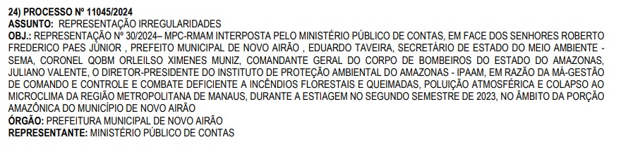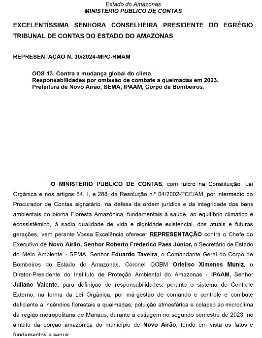 O Ministério Público de Contas (MPC), denunciou o ex-prefeito de Novo Airão, Roberto Frederico Paes Júnior, ao Tribunal de Contas do Estado do Amazonas (TCE-AM), por má condução nas ações de enfrentamento às queimadas durante o segundo semestre de 2023.