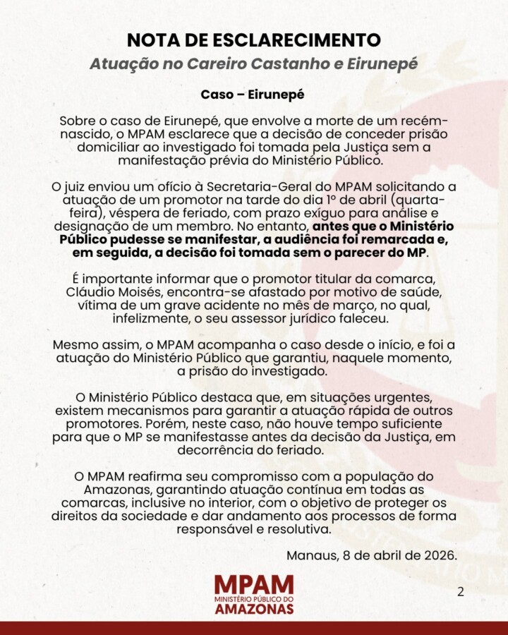 Sobre o caso de Eirunepé, que envolve a morte de um recém-nascido, o MPAM esclarece que a decisão de conceder prisão domiciliar ao investigado foi tomada pela Justiça sem a manifestação prévia do Ministério Público.
