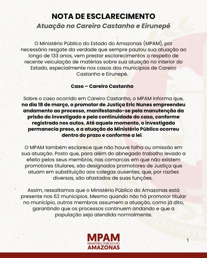 O Ministério Público do Estado do Amazonas (MPAM), por necessário resgate da verdade que sempre pautou sua atuação ao longo de 133 anos, vem prestar esclarecimentos a respeito de recente veiculação de matérias sobre sua atuação no interior do Estado, especialmente nos casos dos municípios de Careiro Castanho e Eirunepé.