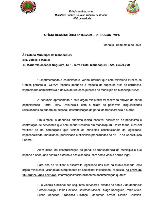 O Ministério Público de Contas (MPC), recebeu uma denúncia contra a prefeita de Manacapuru Valcileia Maciel (MDB), por atos de improbidade administrativa, corrupção e desvios de dinheiro da Prefeitura de Manacapuru.