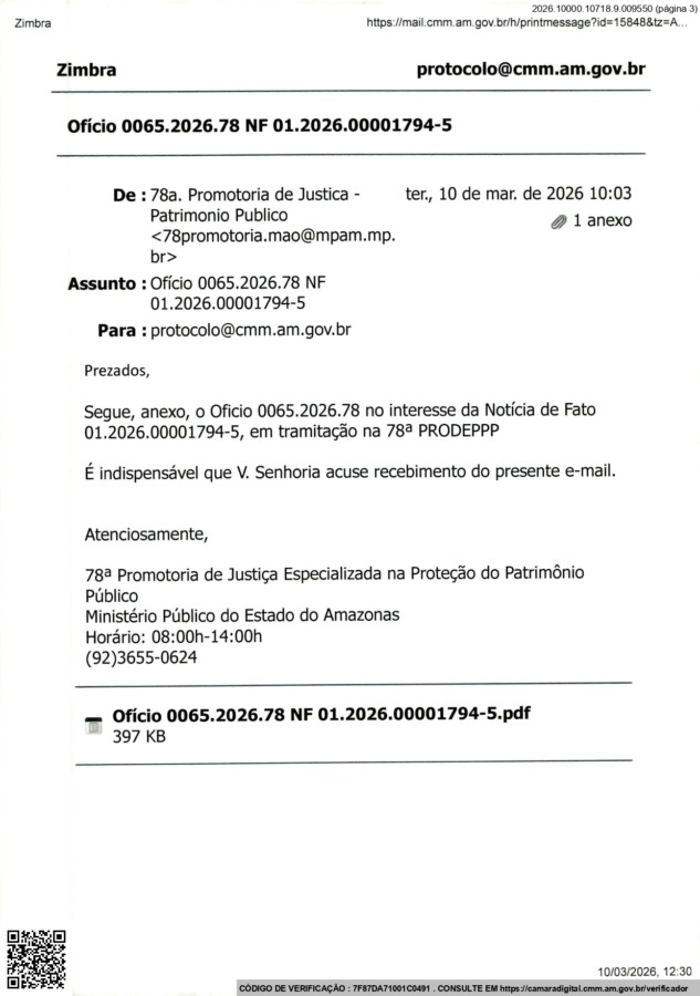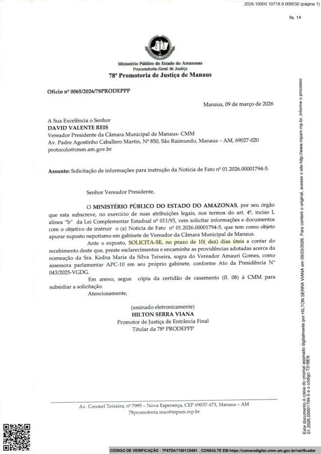 O MP-AM requisitou da Câmara Municipal de Manaus informações detalhadas sobre a nomeação de Kedna Maria da Silva Teixeira, para o gabinete do vereador.