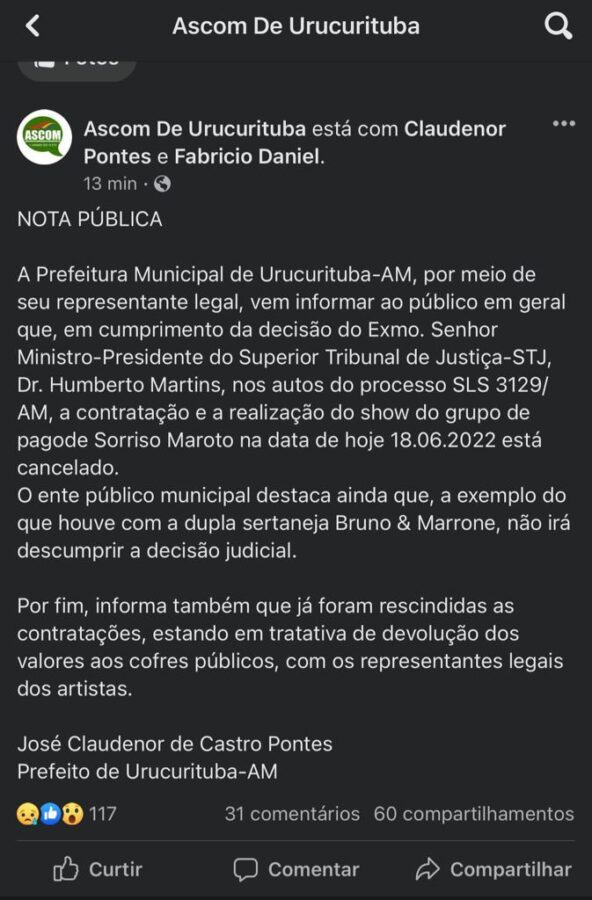 Essa é a segunda vez que o STJ ordena a suspensão dos gastos com shows de artistas nacionais, na festa promovida pelo prefeito José Claudenor, o vulgo “Sabugo”, que gastou mais de R$ 700 mil nos shows de Bruno & Marrone e do grupo de pagode Sorriso Maroto.