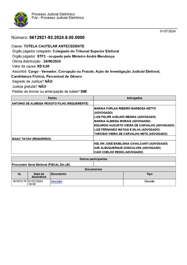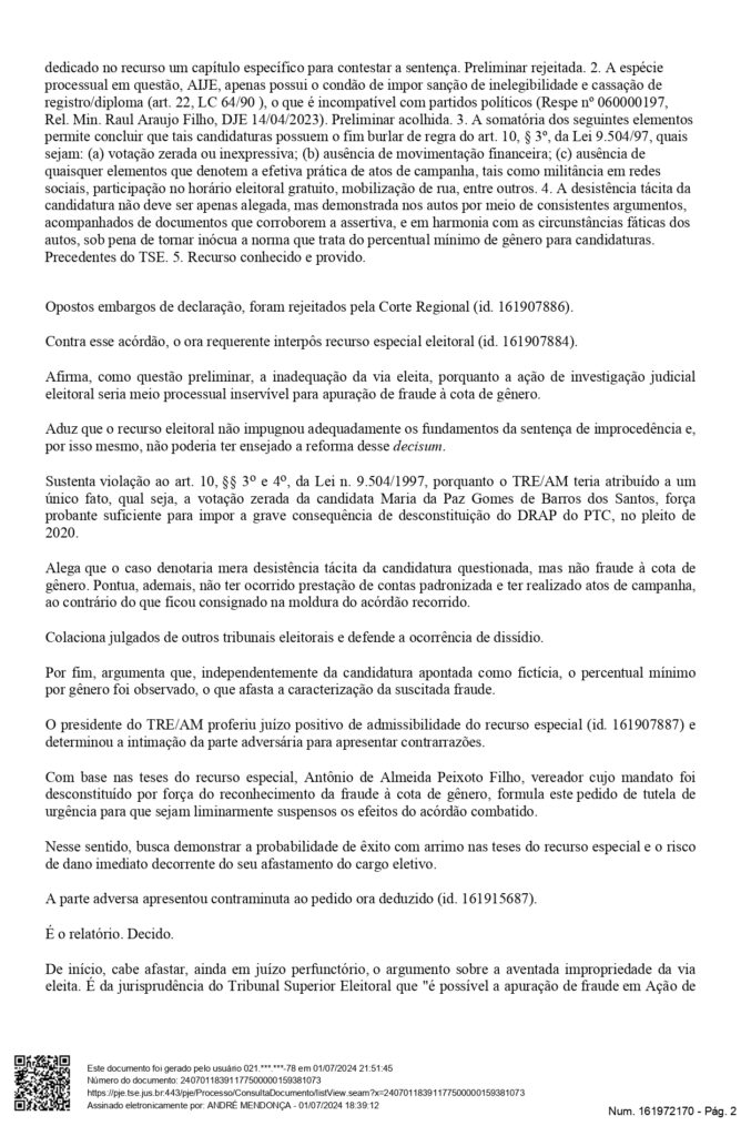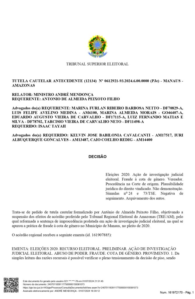Mas de acordo com a decisão do TRE-AM confirmada pelo ministro Mendonça, a candidata “obteve votação zerada, movimentação financeira padronizada e não realizou atos de campanha”, fatos que não foram contestados pela própria defesa de Peixoto.