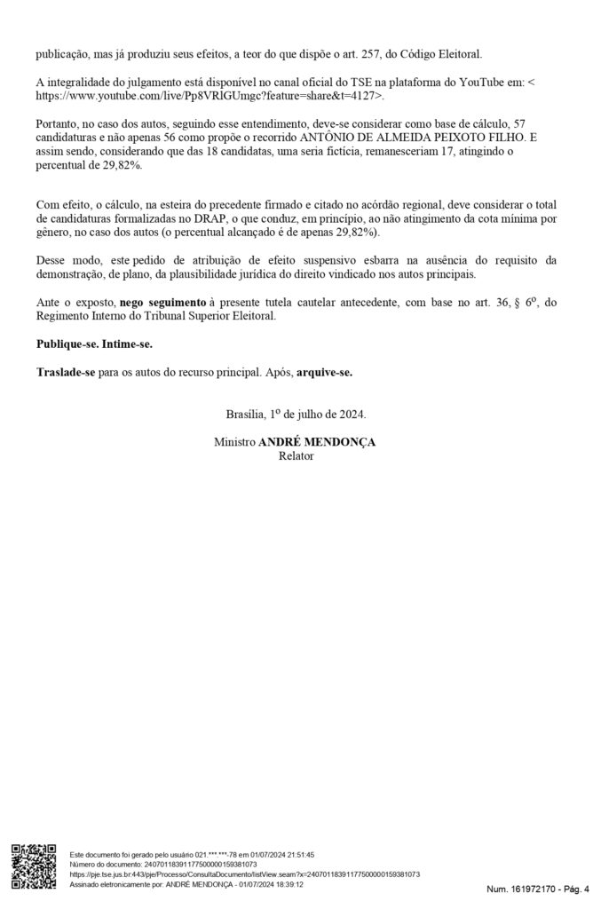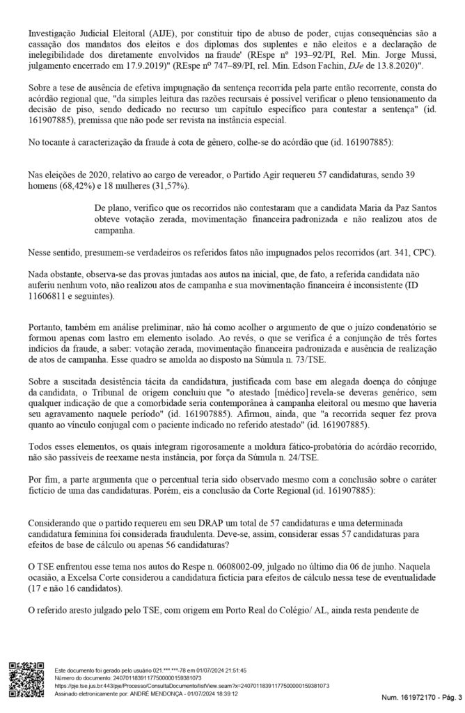 Ainda segundo a decisão do ministro do TSE, as provas apresentadas pela defesa do ex-vereador, que seria um atestado médico que daria o afastamento da suposta candidata, não se comprovou, sendo assim, não justificaria a ausência da mesma na campanha de 2020, onde o partido do vereador foi acusado de fraudar candidaturas de mulheres para atingir a cota necessária segundo a Lei.