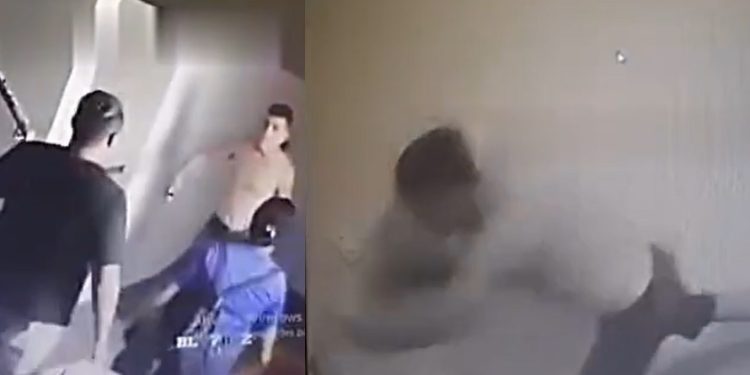 Em um dos vídeos, o suspeito aparece armado com uma faca perseguindo moradores pelas escadas e chutando as portas de moradores. Ele chega a tentar arrombar o carro de algumas pessoas no residencial.
