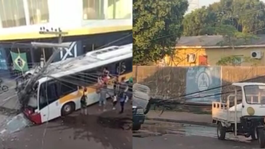 Motorista de ônibus perde o controle e derruba poste em Manacapuru; veja vídeo