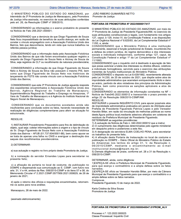 O Ministério Público do Amazonas (MP-AM), instaurou mais um inquérito para apurar atos de improbidade administrativa da prefeita de Presidente Figueiredo Patrícia Lopes. Nesse novo inquérito, o MP-AM vai apurar o crime de improbidade administrativa de Patrícia, após ela vincular seu nome a ações feitas pela prefeitura, o que fere a legislação.