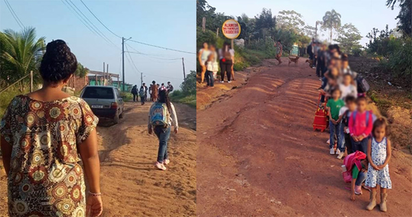 Uma imagem mostra uma fila com as crianças no sol, esperando o transporte que não chega.