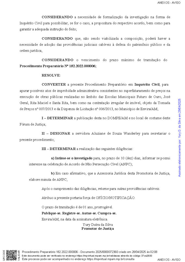 O TCE-AM aponto indícios de danos ao erário, em superfaturamento de obras de escolas municipais em Envira, solicitando ao MP-AM junto ao promotor de justiça Yury Dutra da Silva, que investigasse o prefeito.