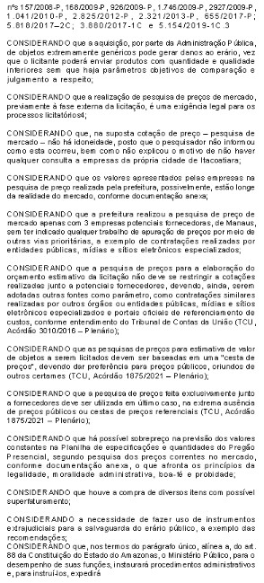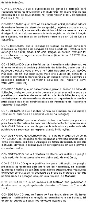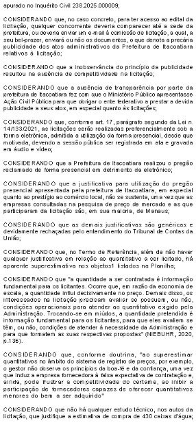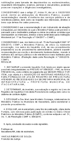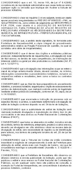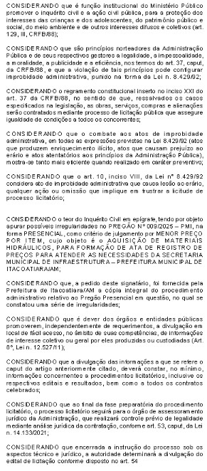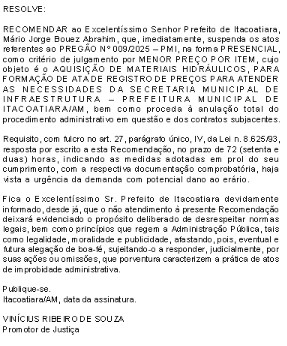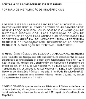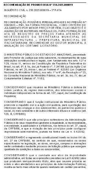 O promotor de de Justiça de Itacoatiara, Vinícius Ribeiro de Souza, pediu a suspensão do imediata suspensão e anulação do Pregão Presencial nº 009/2025 – PMI — modalidade de licitação pública que previa a aquisição de materiais hidráulicos, por irregularidades na publicação da licitação no Portal da Transparência, dificultando assim a ampla concorrência de empresas.
