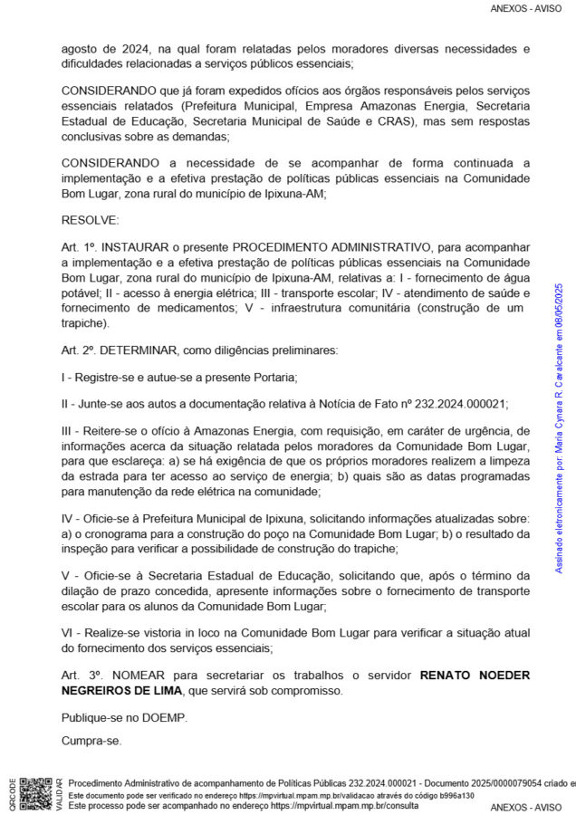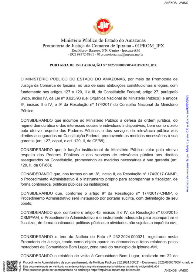 A decisão é da promotora de justiça Maria Cynara Cavalcante e publicada no órgão ministerial na última sexta-feira (9), por conta de dificuldades em áreas essenciais como no caso de fornecimento de água potável, acesso à energia elétrica, transporte escolar, atendimento de saúde e infraestrutura comunitária que seria de obrigação da Prefeitura de Ipixuna.
