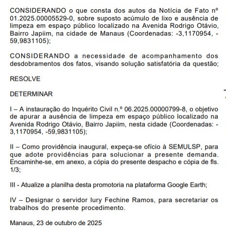 A Prefeitura de Manaus e seu gestor, o prefeito David Almeida (Avante), são alvos de um inquérito civil, para que o Ministério Público do Amazonas (MP-AM) investigue a responsabilidade da Secretaria Municipal de Limpeza Pública (Semulsp), gerida pelo secretário Sabá Reis (Avante), pela falta de limpeza em diversas áreas distintas da capital.