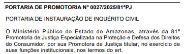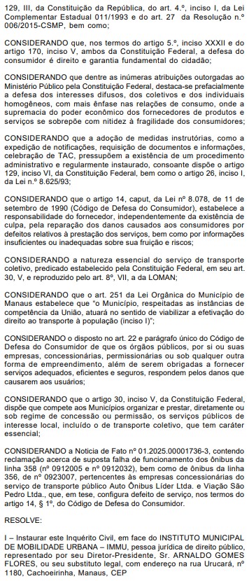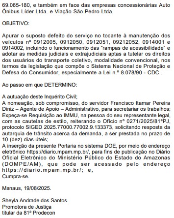De acordo com o documento homologado no Diário Oficial do órgão nesta quarta-feira (27/08), uma denúncia ao MP-AM, de má prestação de serviço de transporte coletivo, fez com que a 81ª Promotoria de Justiça Especializada na Proteção e Defesa dos Direitos do Consumidor, fosse acionada para apurar as irregularidades.