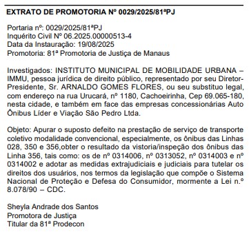 O inquérito conduzido pela Promotora de Justiça Sheyla Andrade dos Santos, deve “Apurar o suposto defeito na prestação de serviço de transporte coletivo modalidade convencional, especialmente, os ônibus das Linhas 028, 350 e 356,obter o resultado da vistoria/inspeção dos ônibus das Linha 356, tais como: os de nº 0314006, nº 0313052, nº 0314003 e nº 0314002 e adotar as medidas extrajudiciais e judiciais para tutelar os direitos dos usuários, nos termos da legislação que compõe o Sistema Nacional de Proteção e Defesa do Consumidor, mormente a Lei n.º 8.078/90 – CDC”.