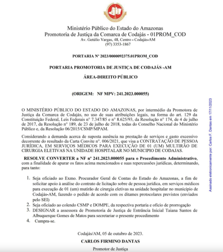 O Ministério Público do Amazonas (MP-AM), vai investigar uma suspeita de superfaturamente na contratação de uma empresa pela Prefeitura de Codajás, para a realização de um multirão de saúde no município.