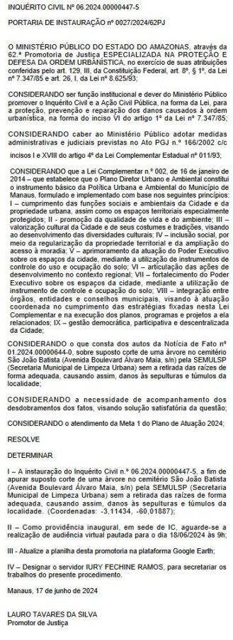 O Ministério Público do Amazonas (MP-AM), abriu uma investigação contra o secretário da Secretaria Municipal de Limpeza Urbana (Semulsp), Sebastião da Silva Reis, mais conhecido como “Sabá Reis”, por retirada de uma árvore no cemitério São João Batista, na Avenida Boulevard, bairro Praça 14, zona Sul da capital.