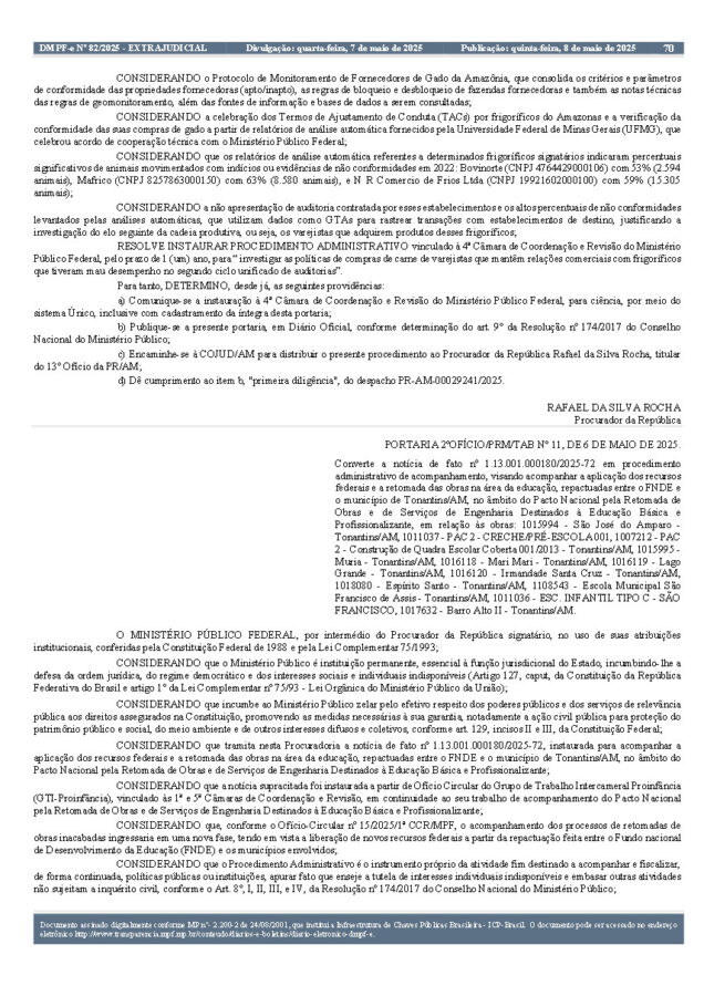 Em abril deste ano, o MPF também instaurou procedimentos administrativos para fiscalizar a aplicação de recursos federais, do Fundo Nacional de Desenvolvimento da Educação (FNDE), destinados à retomada de obras na área da educação em outros três municípios do interior do Amazonas: São Paulo de Olivença, Benjamin Constant e Santo Antônio do Içá.