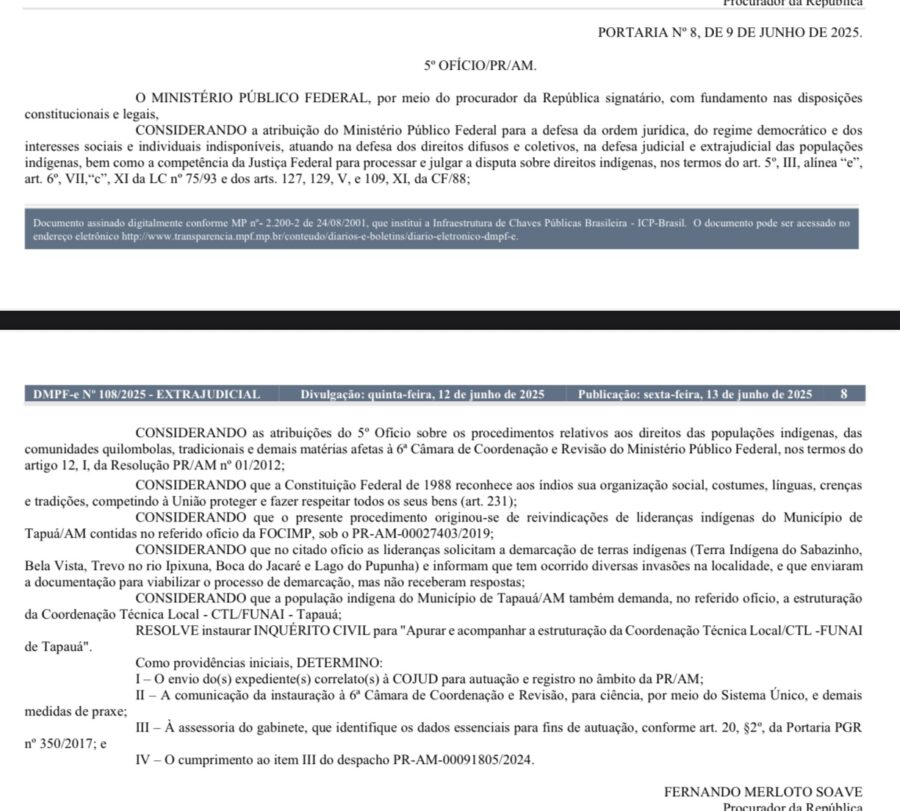 O Ministério Público Federal (MPF), abriu um inquérito para acompanhar a estruturação da Coordenação Técnica Local da Funai de Tapauá, e investigar possíveis invasões de terras indígenas no município.