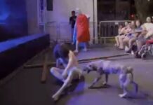 Câmeras de segurança registraram o momento em que o marido começou a agredir o sem-teto, já fora do veículo. O suspeito derrubou a vítima no chão, deu socos e chutes.