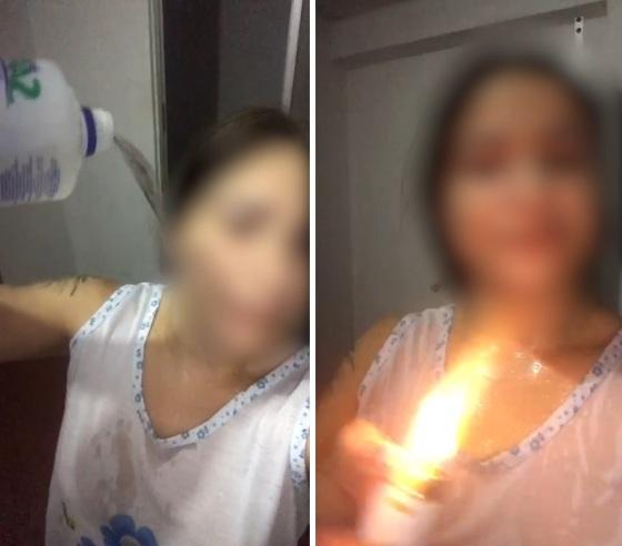 Por não ter o perdão do marido, ela resolveu se punir, a mulher joga álcool no próprio corpo e depois acende um isqueiro e aproxima do corpo, que é tomado por fogo.