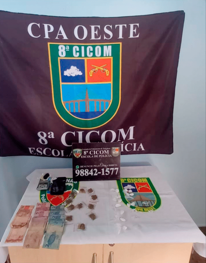 No bairro Compensa, zona Oeste de Manaus, policiais da 8ª Companhia Interativa Comunitária (Cicom) prenderam um homem, de 19 anos, pelo crime de tráfico de drogas. O suspeito estava em posse de 10 trouxinhas de cocaína, cinco porções de oxi, onze embalagens de maconha, uma porção de substância pardacenta, não identificada e R$ 67,50 em espécie. O suspeito foi levado para o 19° Distrito Integrado de Polícia (DIP).