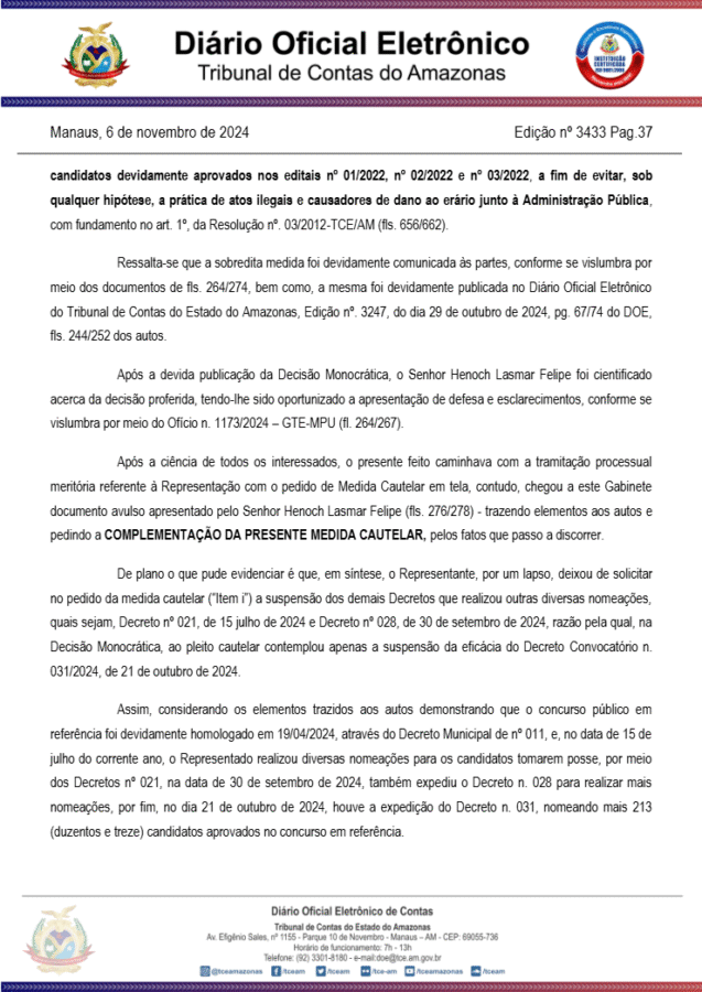 Segundo a denúncia apresentada ao Tribunal de Contas, o concurso foi realizado em junho de 2022 em três editais com oferta de 370 vagas para funções dentro das secretarias da Prefeitura de Fonte Boa, se mostrou irregular já que prefeitura teria nomeado mais de 400 candidatos.