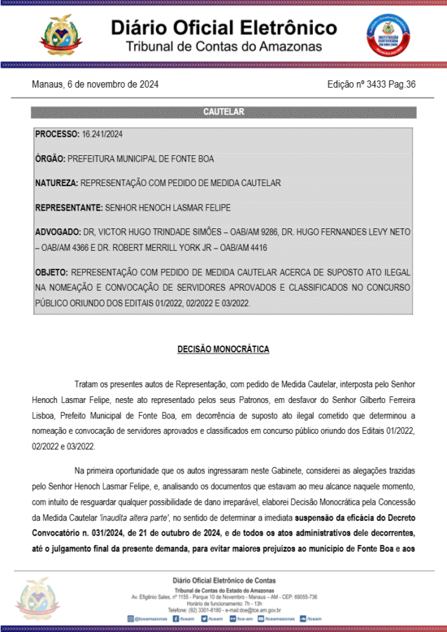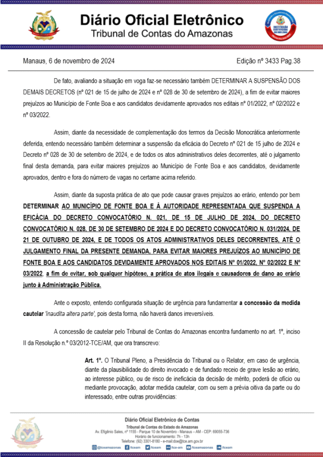 O Tribunal de Contas do Estado do Amazonas (TCE-AM), acatou um pedido de medida liminar suspendendo nomeações e convocações feitas pelo prefeito de Fonte Boa, Gilberto Ferreira Lisboa, mais conhecido como “Biquinho”, no município.