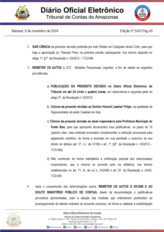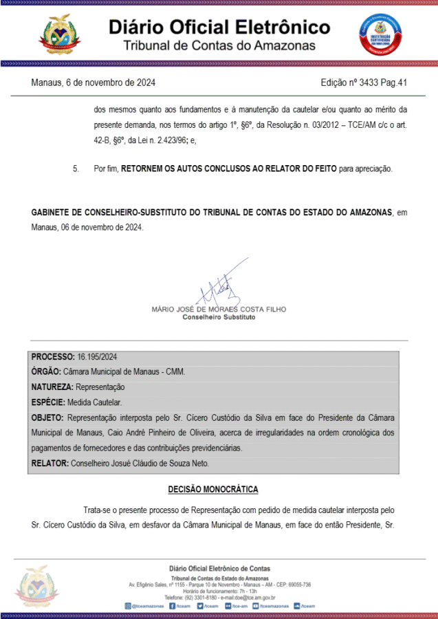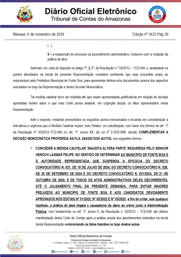 “Diante da necessidade de complementação dos termos da Decisão Monocrática anteriormente deferida, entendo necessário também determinar a suspensão da eficácia do Decreto nº 021 de 15 julho de 2024 e Decreto nº 028 de 30 de setembro de 2024, e de todos os atos administrativos deles decorrentes, até o julgamento final desta demanda”, diz trecho da decisão do Conselheiro TCE-AM.