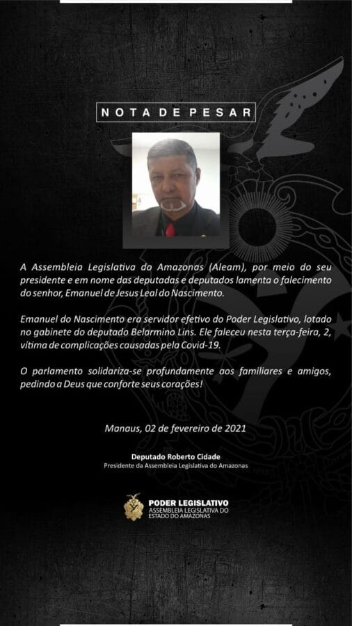 Com grande pesar, o Deputado Belarmino Lins comunica o falecimento do Sr. Emanuel de Jesus Leal do Nascimento, assessor de seu Gabinete por mais de 22 anos, profissional de reconhecida competência, pertencente ao quadro efetivo de servidores da Assembleia Legislativa do Estado do Amazonas (ALE-AM).