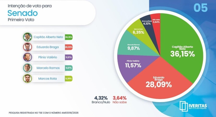 A pesquisa evidencia o crescimento da direita e mostra que o Amazonas quer mudança, renovação e está pronto para um novo tempo. Este é o quarto estudo eleitoral de 2026 que indica a preferência do eleitor pelo nome do deputado Capitão Alberto Neto como futuro representante do estado no Senado Federal em Brasília.