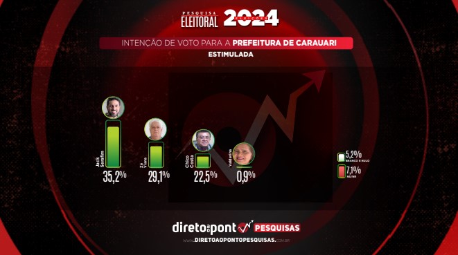 O Instituto Direto ao Ponto Pesquisa, mostra que o comunicado e cientista político Jack Serafim segue na frente na corrida eleitoral pela Prefeitura de Carauari, conforme pesquisa divulgada nesta última segunda-feira (21).