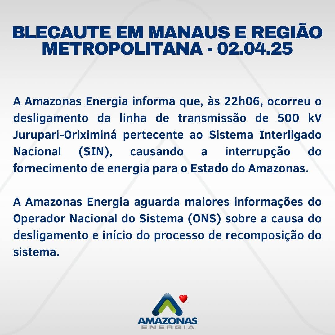 Amazonas Energia informa que, às 22h15, ocorreu um desligamento intempestivo do Linhão de Tucurui, ocasionando blecaute no sistema de Manaus e Interligados, afetando também as cidades de , Manacapuru, Iranduba, Presidente Figueiredo, Parintins e Itacoatiara. No momento, a Amazonas Energia aguarda orientações de restabelecimento pelo Operador Nacional do Sistema – ONS.