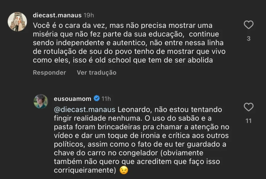 Segundo o menino Amom, ele quis publicar um vídeo em que usa “ironia” e sarcasmo para divulgar, segundo ele, o trabalho voluntário e criticar hábitos populistas de caciques da politica.
