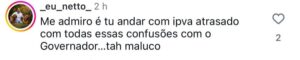 “Eu não fiz nada. Eu só tô aqui porque… porque o sistema é falho. Eu nem bebi. Só tomei duas… três, no máximo. E o IPVA não tem nada a ver com isso.”