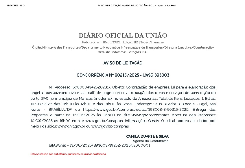 De acordo com o parlamentar, a construção será feita na Manaus Moderna, onde ira se realizar o embarque e desembarque de passageiros. O Governo Federal já homologou nesta última segunda-feira (16), a construção do novo porto de Manaus em seu Diário Oficial da União (DOU), com a licitação da obra.