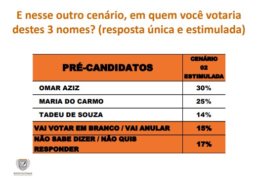 Em um segundo cenário testado, com a inclusão do nome do vice-governador, Tadeu de Souza, Omar Aziz amplia sua vantagem e lidera com 30% das intenções de voto, seguido por Maria do Carmo (25%) e Tadeu (14%).
