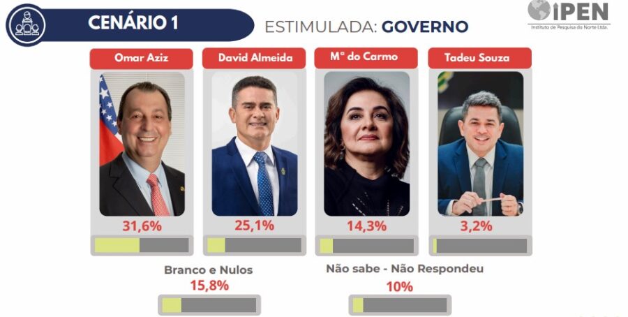 Aziz segue na frente nas pesquisas com 31,6% das intenções de votos da população, seguido pelo prefeito David Almeida (Avante), com 25,1%. Em terceiro lugar aparece a empresária Maria do Carmo (PL), com 14,3 % das intenções.