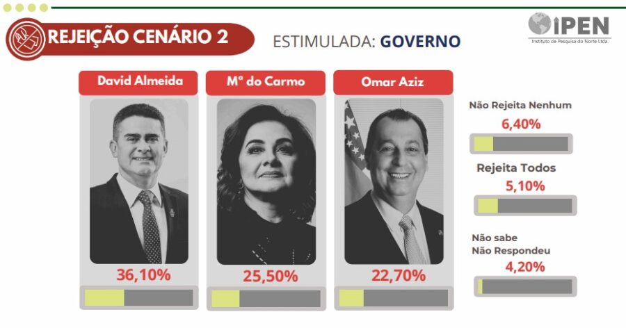 O nome do atual prefeito de Manaus David Almeida é o mais rejeitado pela população, chegando a ter 36,10% de eleitores que afirmam não votar no politico de maneira alguma.