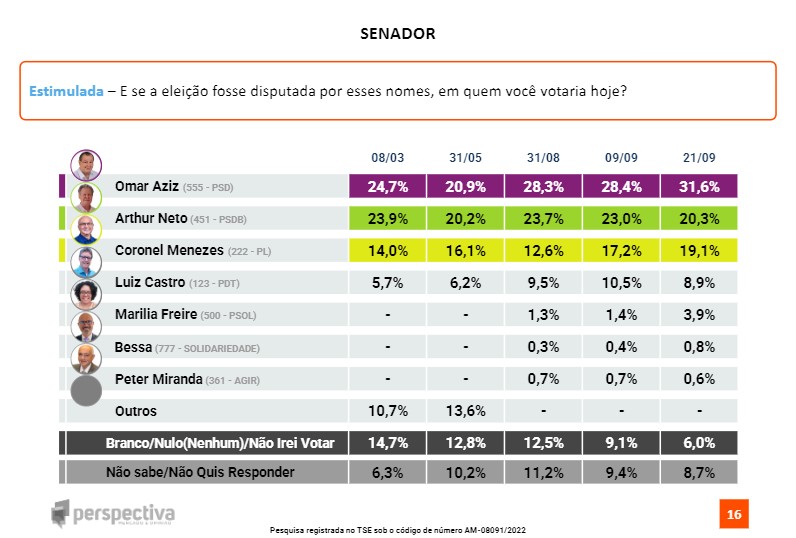 Registrada no Tribunal Superior Eleitoral (TSE) sob o código de número AM-08091/2022, esta é a quinta pesquisa eleitoral da Perspectiva para o cargo de Senador pelo Amazonas e foi executada com recursos da própria empresa. O universo amostral é de 1.500 entrevistas realizadas na capital amazonense e nos 24 maiores colégios eleitorais do interior do estado, entre os dias 18 e 20 de setembro do ano corrente. A margem de erro é de 2,5%, para mais ou para menos, com grau de confiabilidade de 95,0%, o que significa dizer que se fossem feitas 100 entrevistas com a mesma metodologia, 95 estariam dentro da margem de erro prevista.