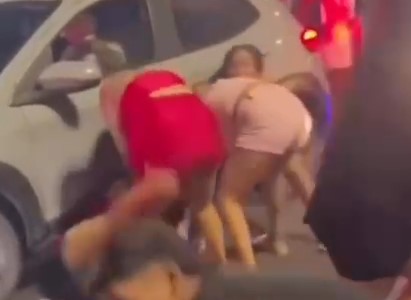 Pelo menos cinco mulheres são vistas em uma violenta briga no local, com direito a troca de socos, puxões de cabelos e até apliques de meha hair sendo arrancado durante a confusão.