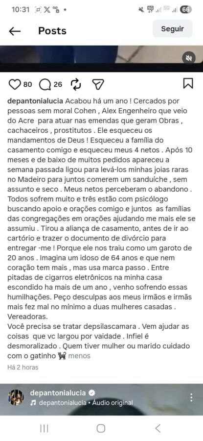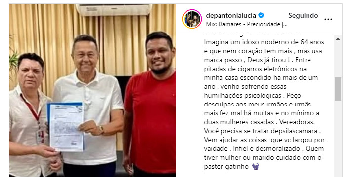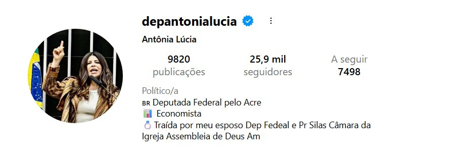 Em uma rede social, a parlamentar atualizou a “biografia” do perfil, incluindo a frase “Traída por meu esposo”. Antônia Lúcia descreveu o distanciamento do marido e o impacto sobre os netos do casal: “Ele esqueceu a família do casamento comigo e esqueceu meus quatro netos. Todos sofrem muito e três estão com psicólogo buscando apoio e orações comigo e juntos as famílias das congregações ajudando”, escreveu.