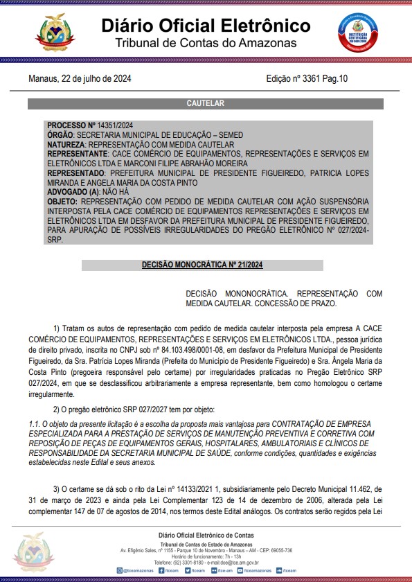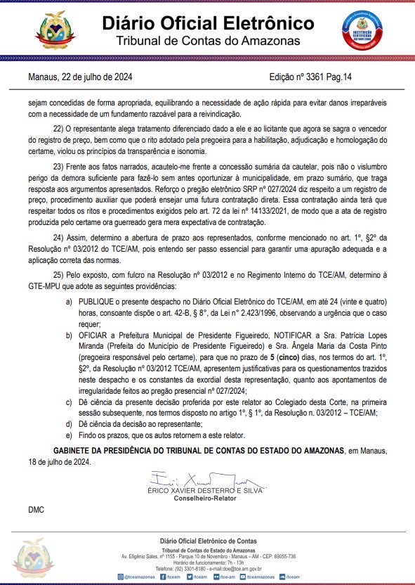 Patrícia Lopes e a pregoeira Ângela Maria da Costa Pinto, serão notificadas pelo Tribunal de Contas do Estado do Amazonas (TCE-AM), e tem um prazo de cinco dias para responder e apresentar suas justificativas para o questionamentos trazidos quanto aos apontamentos de irregularidade feitos ao pregão presencial nº 027/2024.