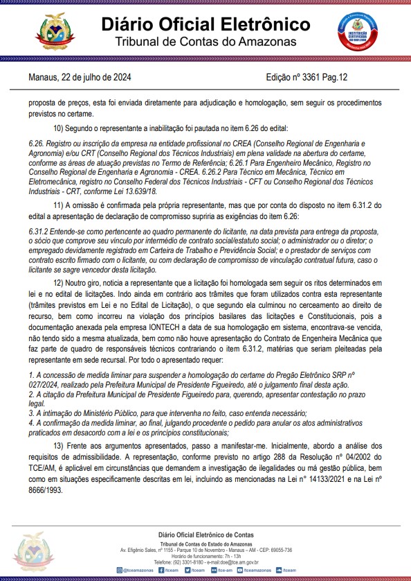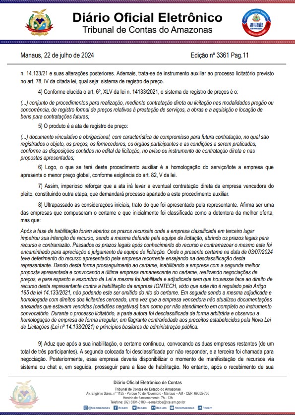 A representante alegou no TCE-AM que a empresa habilitada teve um “tratamento diferenciado dado a ele e ao licitante que agora se sagra o vencedor do registro de preço, bem como que o rito adotado pela pregoeira para a habilitação, adjudicação e homologação do certame, violou os princípios da transparência e isonomia”, diz o trecho da denúncia.