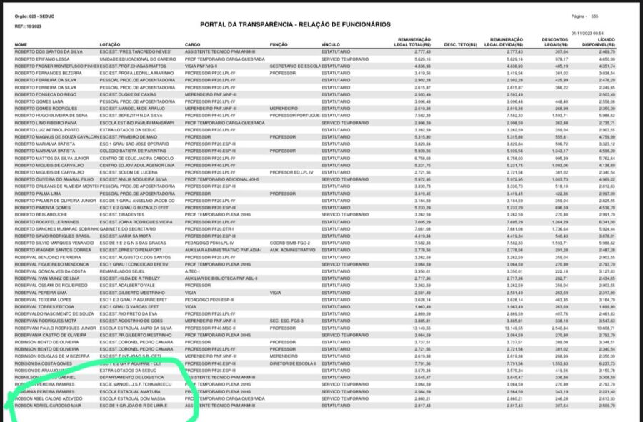 Outra denúncia que circula na cidade aponta que Robson Adriel seria funcionário fantasma na Escola Estadual Senador João Bosco Ramos de Lima. Segundo relatos, ele também teria exercido função no gabinete do deputado federal Silas Câmara (Republicanos), situação que levanta questionamentos sobre possível acúmulo de cargos, inclusive após assumir a função de vice-prefeito.
