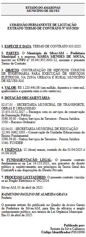 De acordo com o Diário Oficial dos Municípios (DOM), Paulino Grana contratou a empresa MARIA MENDES DE SOUSA para executar serviços de engenharia e elétrica na zona urbana e rural de Silves, pelo valor total de R$ 1.220.440,08 (um milhão, duzentos e vinte mil, quatrocentos e quarenta reais e oito centavos), para atender as demandas da Secretaria Municipal de Transportes, Obras e Urbanismo.