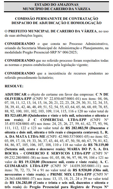 Já a empresa J. C. COMERCIAL LTDA – EPP vai receber da Prefeitura do Careiro da Várzea o valor total de R$ R$ 282.083,50 (duzentos e oitenta e dois mil, oitenta e três reais e cinquenta centavos).