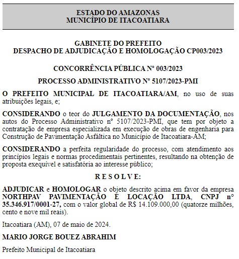 Segundo informações do Diário Oficial dos Municípios (DOM), a empresa NORTHPAV PAVIMENTAÇÃO E LOCAÇÃO LTDA, vai receber R$ 14.109.000,00 (quatorze milhões, cento e nove mil reais), para realizar o trabalho de pavimentação nas ruas do município de Itacoatiara.