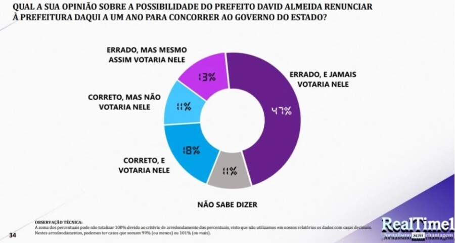 De acordo com o estudo, cerca de 47% dos entrevistados, consideram que não votariam em David Almeida em caso dele deixar o cargo de prefeito, para disputar as eleições em 2026 como candidato ao Governo do Amazonas.