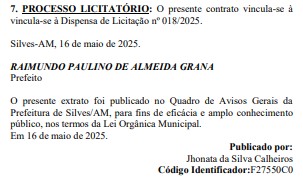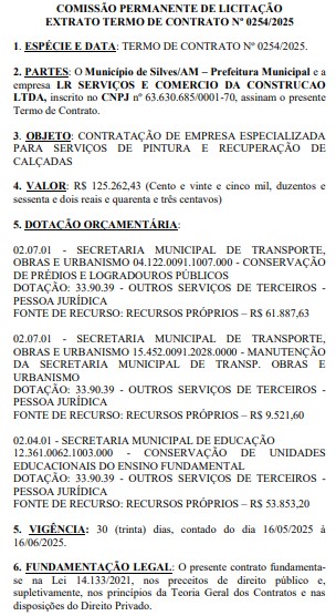 De acordo com informações do Diário Oficial dos Municípios (DOM) desta terça-feira (17), Professor Paulino Grana contratou a empresa L.R. SERVIÇOS E COMÉRCIO DA CONSTRUÇÃO LTDA, pelo valor de R$ 125.262,43 (cento e vinte e cinco mil, duzentos e sessenta e dois reais e quarenta e três centavos), para o serviço de pintura e recuperação de calçadas em Silves.
