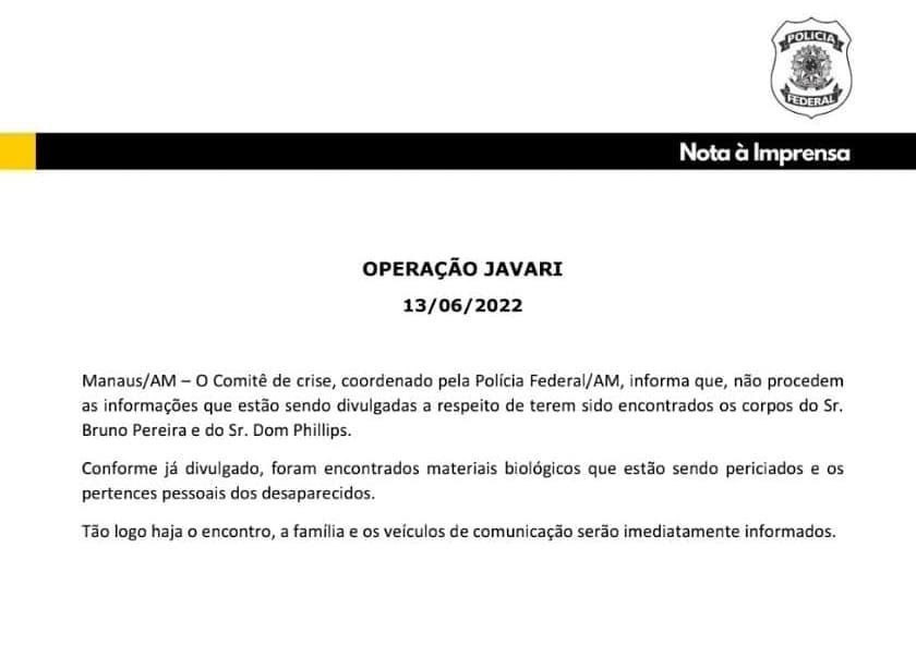 “O Comitê de crise, coordenado pela Polícia Federal/AM, informa que, não procedem as informações que estão sendo divulgadas a respeito de terem sido encontrados os corpos do Sr. Bruno Pereira e do Sr. Dom Phillips. Conforme já divulgado, foram encontrados materiais biológicos que estão sendo periciados e os pertences pessoais dos desaparecidos. Tão logo haja o encontro, a família e os veículos de comunicação serão imediatamente informados”, informaram.
